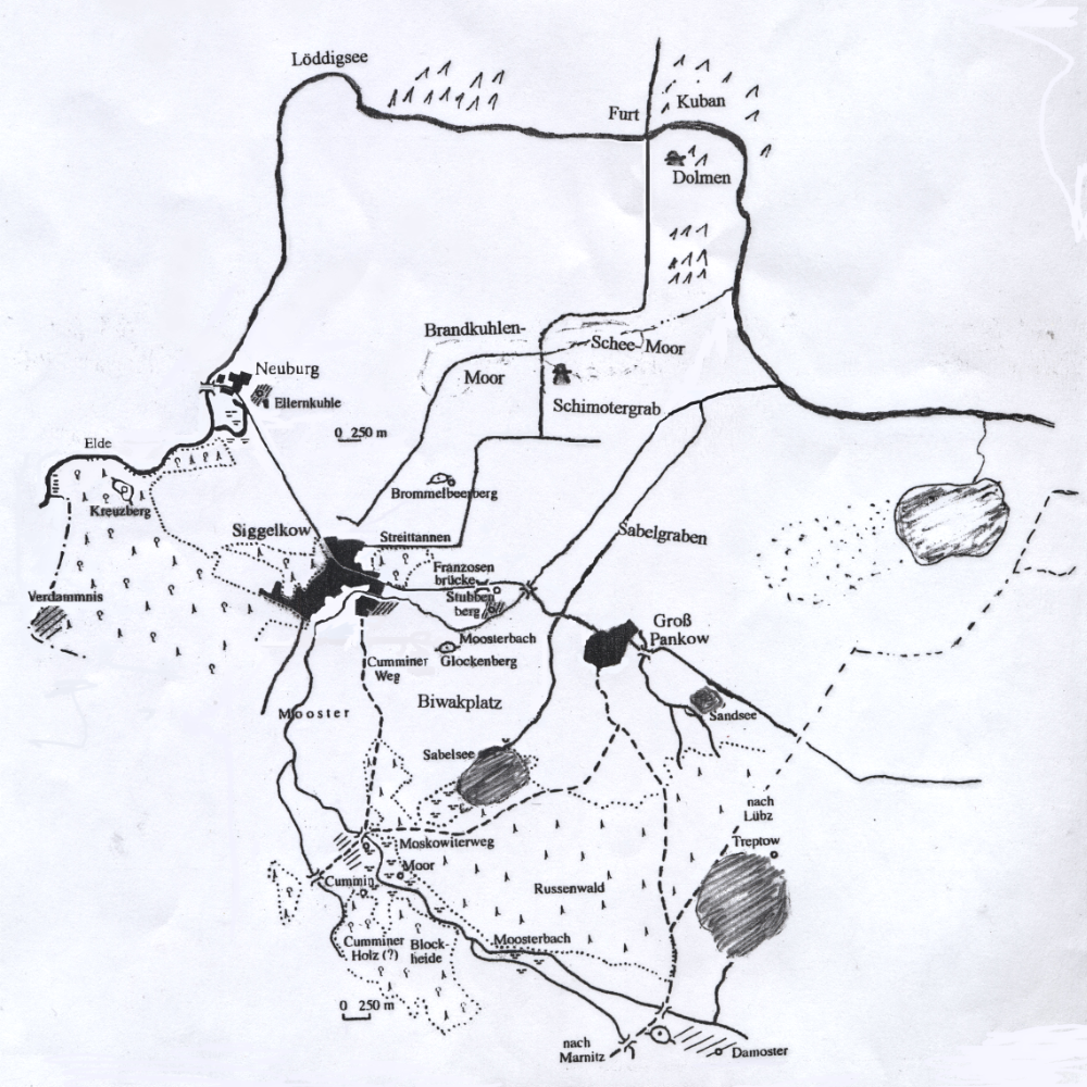 den sie mit Erleichterung und Jubel empfangen. Kurz vor Siggelkow, im Dünengelände der späteren „Instritannen“ findet man noch die Spuren einer eilig aufgeworfenen kleineren Verteidigungsstellung, mit der eine französische Einheit offensichtlich versucht